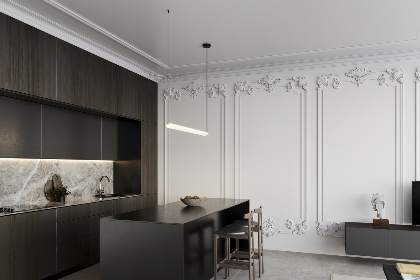 Habilite una iluminación funcional por encima de las áreas de trabajo. Opte por elementos de iluminación que alumbren la encimera uniformemente.